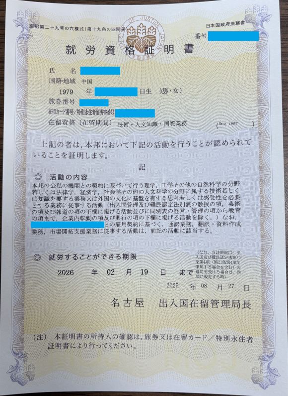 静岡県の会社様から中国人のお客様の、「技術・人文知識・国際業務」ビザの就労資格証明書のご依頼をいただき無事に証明書をいただきました!